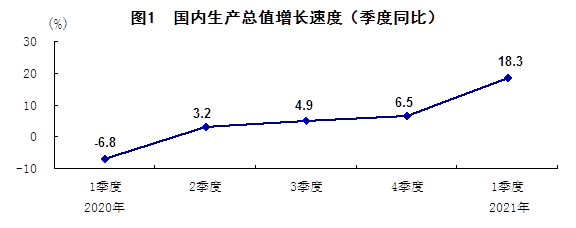 北京4月16日讯 国家统计局16日发布数据,初步核算,一季度国内生产总值249310亿元,按可比价格计算,同比增长18.3%,比2020年四季度环比增长0.6%;比2019年一季度增长10.3%,两年平均增长5.0%。分产业看,第一产业增加值11332亿元,同比增长8.1%,两年平均增长2.3%;第二产业增加值92623亿元,同比增长24.4%,两年平均增长6.0%;第三产业增加值145355亿元,同比增长15.6%,两年平均增长4.7%。一方面,一季度国内生产总值同比增长18.3%,受到上年较低基数、员工就地过年工作日有所增加等不可比因素影响;另一方面,一季度环比增长0.6%,两年平均增长5.0%,表明我国经济稳定恢复。