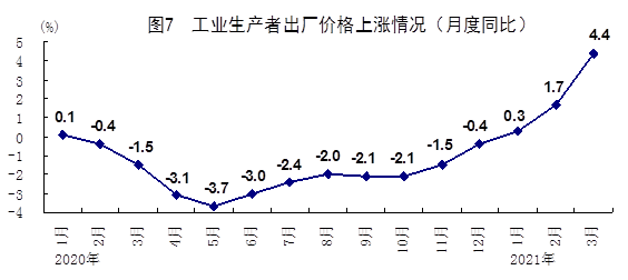 一季度,全国工业生产者出厂价格同比上涨2.1%。其中3月份同比上涨4.4%,涨幅比2月份扩大2.7个百分点,环比上涨1.6%。一季度,全国工业生产者购进价格同比上涨2.8%。其中3月份同比上涨5.2%,涨幅比2月份扩大2.8个百分点,环比上涨1.8%。