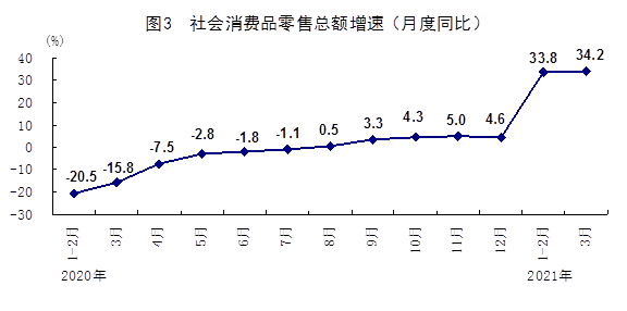 一季度,社会消费品零售总额105221亿元,同比增长33.9%,环比增长1.86%;两年平均增长4.2%。其中,3月份社会消费品零售总额35484亿元,同比增长34.2%,比1-2月份加快0.4个百分点,两年平均增长6.3%,环比增长1.75%。按经营单位所在地分,一季度城镇消费品零售额91345亿元,同比增长34.6%,两年平均增长4.3%;乡村消费品零售额13875亿元,同比增长29.4%,两年平均增长3.2%。按消费类型分,餐饮收入10596亿元,同比增长75.8%,两年平均下降1.0%;商品零售94625亿元,同比增长30.4%,两年平均增长4.8%。从商品类别看,一季度限额以上单位商品零售额中,18个商品类别同比增速均超过10%,其中体育娱乐用品类和通讯器材类商品同比分别增长45.2%、42.4%,两年平均分别增长17.4%、17.1%。全国网上零售额28093亿元,同比增长29.9%,两年平均增长13.5%。其中,实物商品网上零售额23067亿元,同比增长25.8%,两年平均增长15.4%;占社会消费品零售总额的比重为21.9%,比1-2月份提高1.2个百分点。