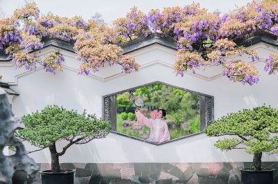 陈影身着汉服在无锡蠡园拍摄的照片。光明图片