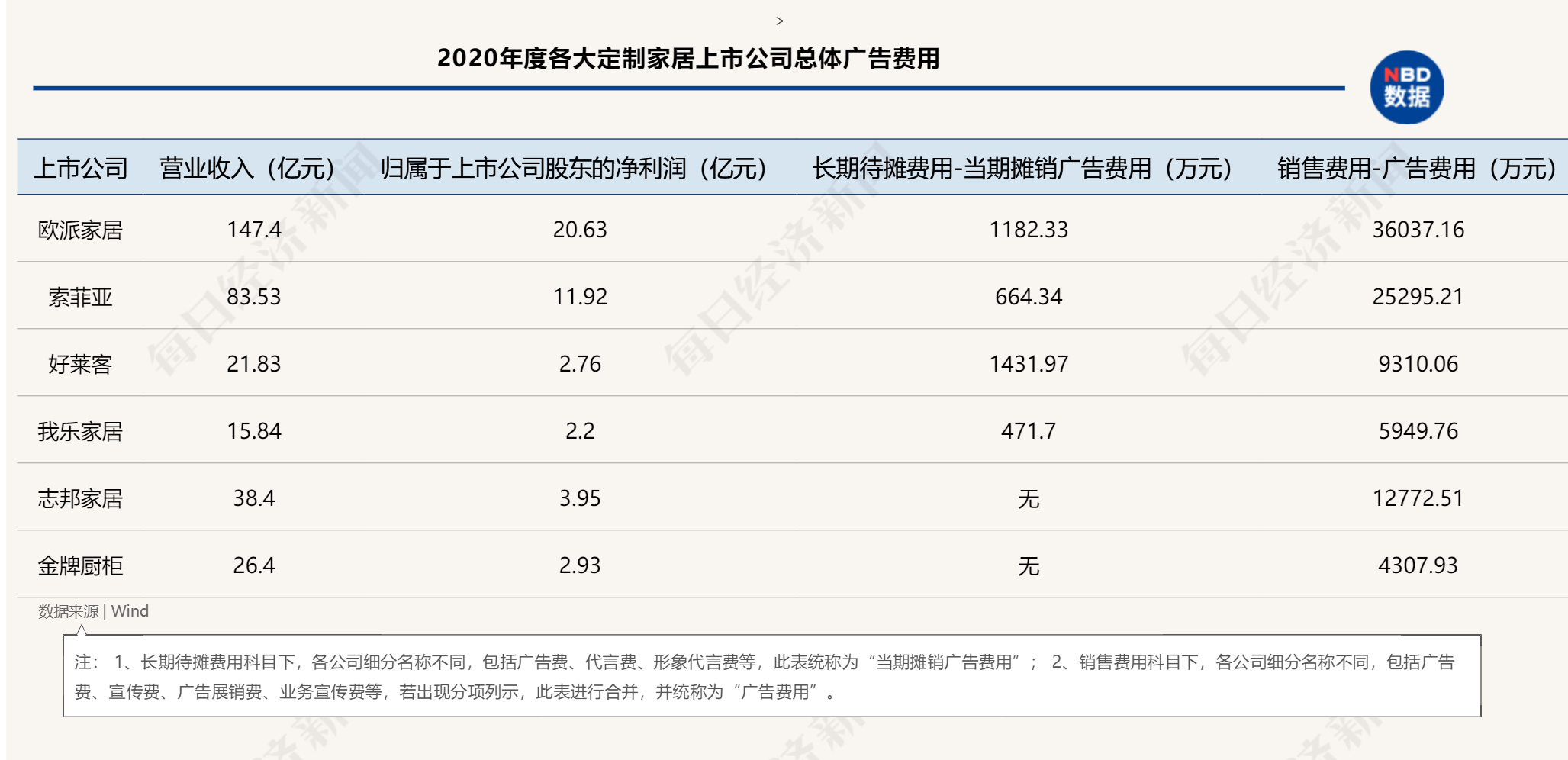 不过,记者整理已发布2020年报的上市公司发现,各家对这笔费用的财务处理或有不同,主要有销售费用、长期待摊费用两个科目中涉及广告宣传、形象代言费,以下是去年各大定制家居上市公司总体广告费用对比: