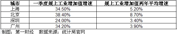 数据显示,今年一季度,北京全市规模以上工业(下称“规上工业”)增加值同比增长38.4%,两年平均增长8.7%;上海规上工业增加值同比增长34.5%,两年平均增长5.2%;广州规上工业增加值达1111.29亿元,同比增长34.2%,两年平均增长3.9%;深圳规上工业增加值同比增长24.0%,两年平均增长3.4%。