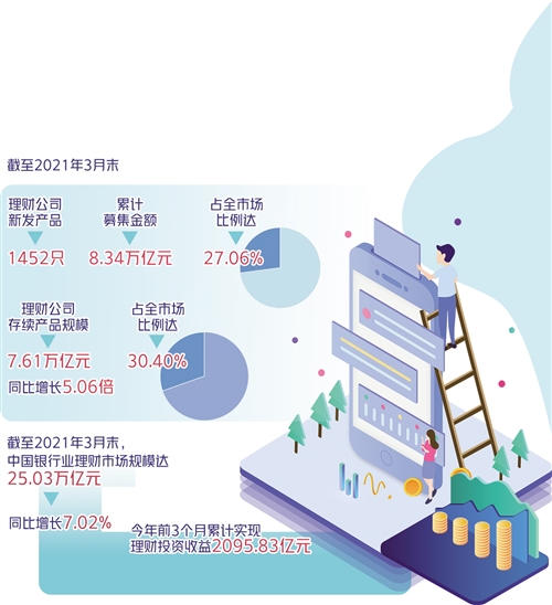 银行理财转型正进入深水区。银行业理财登记托管中心4月27日在北京发布的《中国理财市场2021年一季度报告》(以下简称《报告》)显示,截至2021年3月末,中国银行业理财市场规模达25.03万亿元,同比增长7.02%;全市场新增理财投资者817.15万,达4979.63万,今年前3个月累计实现理财投资收益2095.83亿元,较好地满足了投资者的资产保值增值需求。
