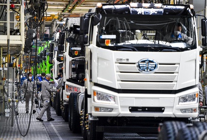 一汽解放汽车有限公司职工在长春生产基地总装车间内进行装配作业。记者 许畅 摄