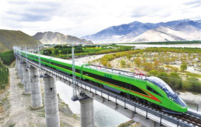 试运行的复兴号列车行驶在西藏山南市境内。 新华社记者 觉果摄