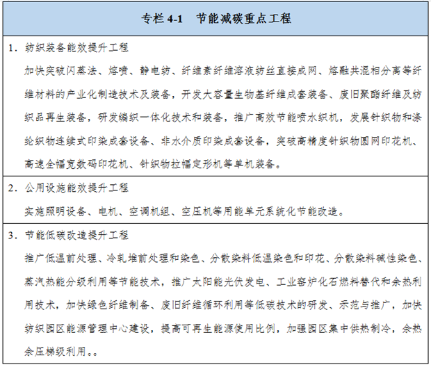 2.促进能源效率稳步提升。强化节能减碳标准约束,引导支持企业低耗能、低耗水项目建设。运用能耗限额、取水定额、行业规范条件等标准法规,推动行业绿色升级改造,着力提高绿色产品设计开发能力,积极开发高附加值、低能耗纺织产品。开展能效领跑者引领行动,树立能源高效利用企业示范样板。