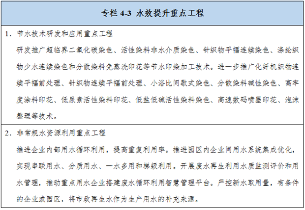 2.提高用水效率。大力推广先进适用的节水工艺、技术和装备,推进水资源高效利用和废水资源化,鼓励纺织企业加大循环水、再生水等非常规水资源开发力度,建设非常规水资源利用产业化示范工程。加快完善行业节水标准,推动企业用水效率对标达标。开展水效领跑者引领行动,加强用水管理和水系统集成优化,创建一批典型节水示范项目和标杆企业。