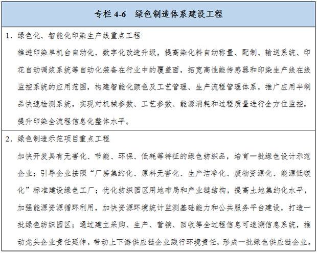 4.绿色制造体系更加完善。全面推行生命周期绿色管理,全力打造一批绿色工厂、绿色园区和绿色供应链示范企业,推出更多绿色纺织产品。将绿色纤维标志与认证体系建设纳入产品绿色设计中,鼓励龙头企业绿色采购,打通更多绿色产品销售渠道,引导绿色消费。