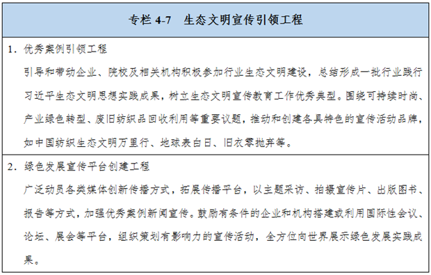 提升行业生态文明建设宣教能力,加强信息传播能力建设,建立功能完善、互联互通的信息网络平台,做好产业政策宣传引导,加大信息公开和新闻宣传力度,维护公众的环保知情权。注重树立先进典型,讲好纺织环保故事,组织开展经验交流,营造绿色发展良好氛围。充分发动和依靠全社会力量,引导公众绿色消费,形成人民群策群力、共建共享的生动局面,为行业绿色发展提供保障。