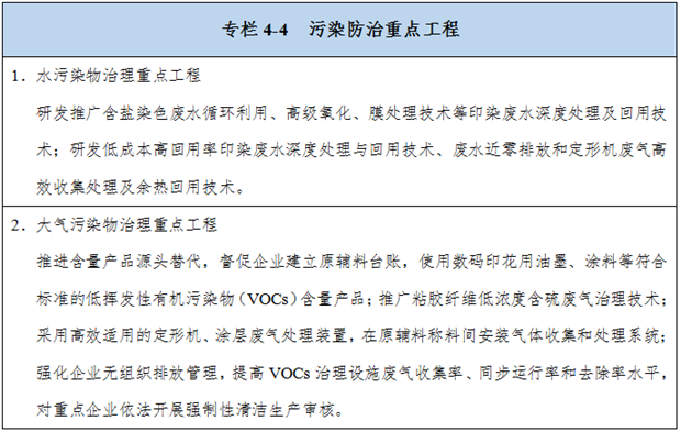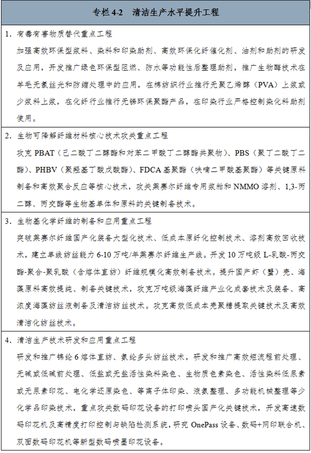 1.强化清洁生产。以绿色技术驱动产业链各环节降低污染物产排量为核心,深化生产全过程和纺织园区系统化污染防治。制定有毒有害物质替代目录,加强无毒无害物质开发和应用,重视新兴污染物治理,加强可降解纤维材料研发应用,引导行业技术进步和产业结构优化升级。加大清洁能源使用,推进能源梯级利用。加大清洁生产改造力度,持续削减化学需氧量、氨氮、氮氧化物等重点污染物产排量。