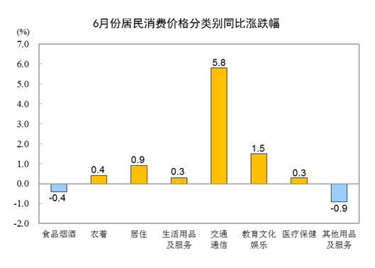 其他七大类价格同比六涨一降。其中,交通通信、教育文化娱乐、居住价格分别上涨5.8%、1.5%和0.9%,衣着、生活用品及服务、医疗保健价格分别上涨0.4%、0.3%和0.3%;其他用品及服务价格下降0.9%。