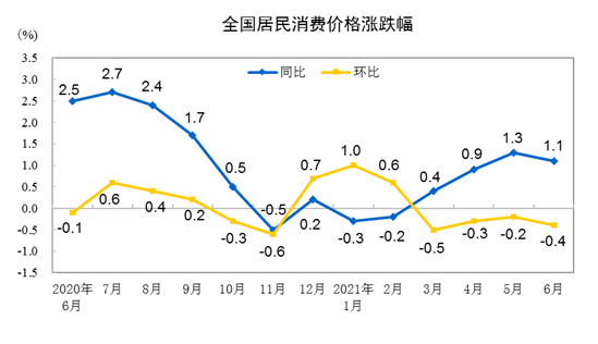 2021年6月份,全国居民消费价格同比上涨1.1%。其中,城市上涨1.2%,农村上涨0.7%;食品价格下降1.7%,非食品价格上涨1.7%;消费品价格上涨1.1%,服务价格上涨1.0%。上半年,全国居民消费价格比去年同期上涨0.5%。