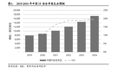 2019-2024年中国IT安全市场支出预测 资料来源:IDC,新时代证券研究所