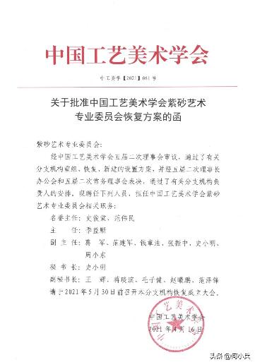 今年年初,中国工艺美术学会五届二次理事会召开。会上,中国工艺美术学会恢复了中国工艺美术学会紫砂艺术专业委员会的设置。据晚报记者了解,在此之前,中国工艺美术学会紫砂艺术专业委员会由于长期没有开展实质性工作,相关工作架构一度被搁置。新一届中国工艺美术学会紫砂艺术专业委员会旨在充分发挥专委会的专业性、权威性,促进紫砂行业高质量、健康有序发展,切实服务好紫砂行业。(江南晚报记者何小兵)