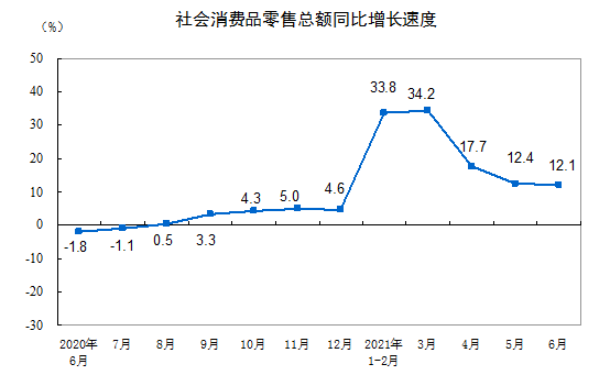 6月份,社会消费品零售总额37586亿元,同比增长12.1%;比2019年6月份增长10.0%,两年平均增速为4.9%。其中,除汽车以外的消费品零售额33719亿元,增长13.1%。扣除价格因素,2021年6月份社会消费品零售总额实际增长9.8%,两年平均增长3.2%。从环比看,6月份社会消费品零售总额增长0.7%。