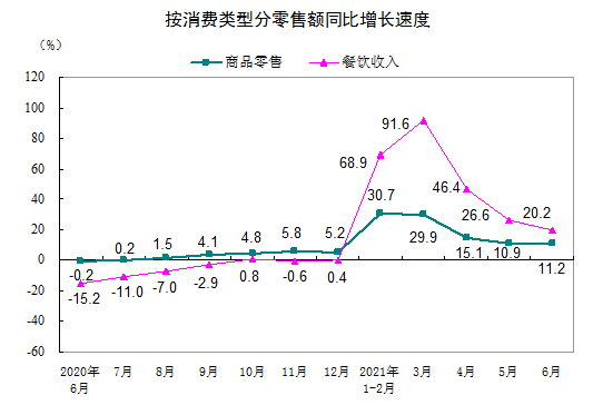 按消费类型分,6月份,商品零售33663亿元,同比增长11.2%,两年平均增长5.4%;餐饮收入3923亿元,增长20.2%,两年平均增长1.0%。1—6月份,商品零售190192亿元,同比增长20.6%,两年平均增长4.9%;餐饮收入21712亿元,增长48.6%,规模与2019年1-6月基本持平。
