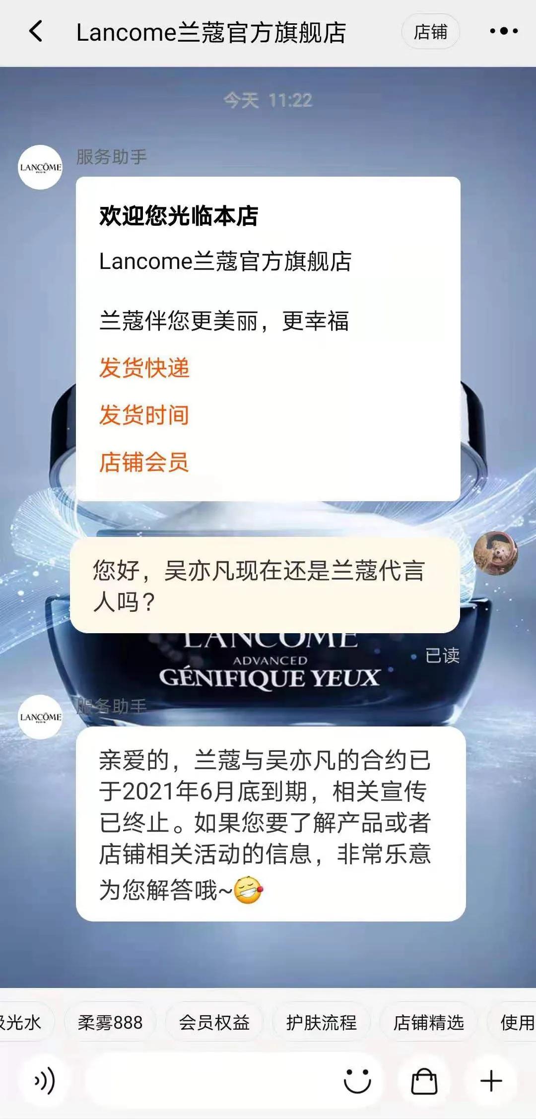 除首位表态的韩束以及王者荣耀、华帝公司外,兰蔻官方旗舰店客服表示,与吴亦凡的合约已于2021年6月底到期,相关宣传已终止。