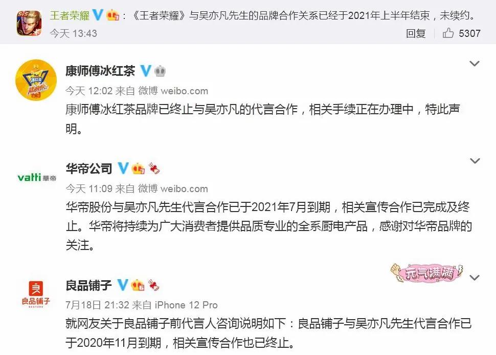 19日稍早,华帝公司发文称与吴亦凡代言合作已于2021年7月到期,相关宣传合作已完成及终止。康师傅冰红茶发布声明称,“已终止与吴亦凡的代言合作,相关手续正在办理中”。