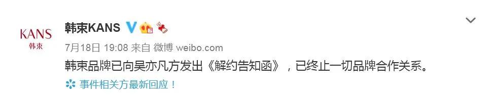 7月18日19时8分,韩束官方微博发文称,已向吴亦凡方发出《解约告知函》,已终止一切品牌合作关系。这是吴亦凡被都美竹爆料后,首个明确提出解约的品牌。“韩束与吴亦凡解约”迅速登上微博热搜。