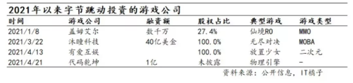 而另一方面,字节跳动亦成为腾讯在游戏领域不可忽视的挑战力量。自从2021年初以来,字节跳动投资的游戏公司有4家。