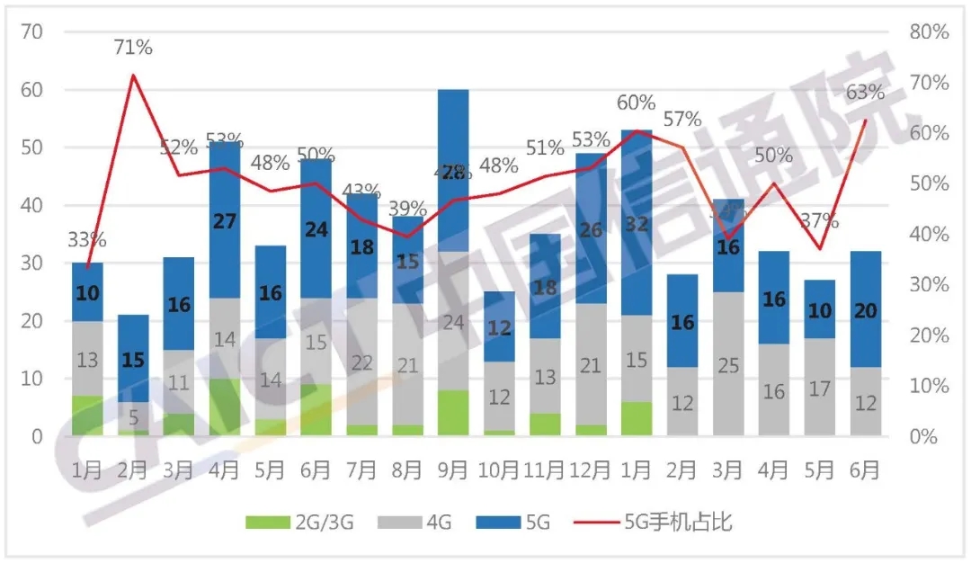 2021年6月,国内手机上市新机型32款,同比下降33.3%,其中5G手机20款,同比下降16.7%,占同期手机上市新机型数量的62.5%。