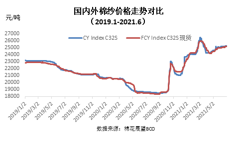 本月内外棉纱价格均上涨,国产32支纯棉纱6月均价为25191元/吨,较上月上涨了191元,涨幅0.76%,较去年同期上涨了6499元,涨幅34.8%;进口32支纯棉纱6月均价为25075元/吨,较上月上涨了243元,涨幅0.98%,较去年同期上涨了6560元,涨幅35.4%.