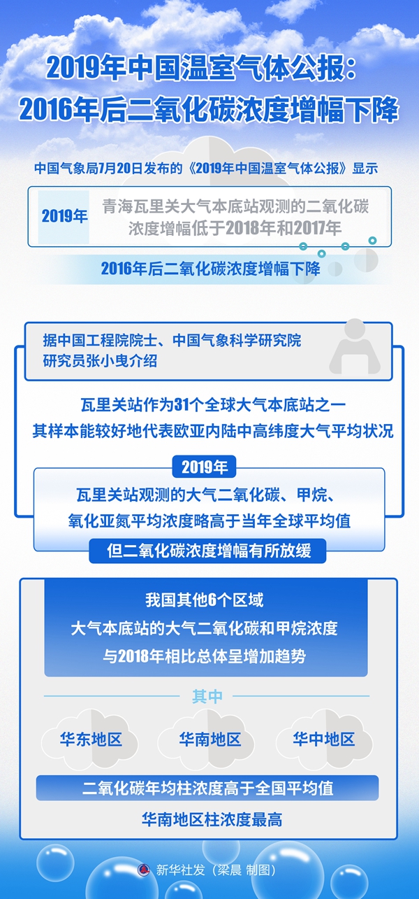 北京7月20日电(记者黄垚)中国气象局20日发布的《2019年中国温室气体公报》显示,2019年,青海瓦里关大气本底站观测的二氧化碳浓度增幅低于2018年和2017年,2016年后二氧化碳浓度增幅下降。