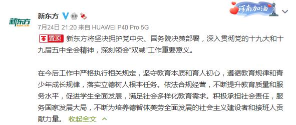 24日深夜,新东方在官博表示,将坚决拥护党中央、国务院决策部署,深刻领会“双减”工作重要意义。在今后工作中严格执行相关规定,坚守教育本质和育人初心,遵循教育规律和青少年成长规律,落实立德树人根本任务。依法合规经营,不断提升教育质量和服务水平,促进学生全面发展,满足社会多样化教育需求。积极承担社会责任,服务国家发展大局,不断为培养德智体美劳全面发展的社会主义建设者和接班人贡献力量。