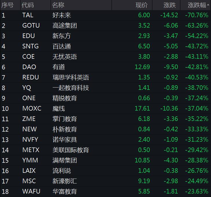 二级市场方面,美东时间周五(23日),中概教育股重挫,好未来领跌中概股,跌幅超70%,高途集团、新东方、无忧英语、精锐教育、掌门教育等纷纷大跌。在此之前,港股上市的几家教育股同样大幅下跌,截至23日港股收盘,新东方跌超40%,思考乐教育跌近29%,新东方在线跌28%。