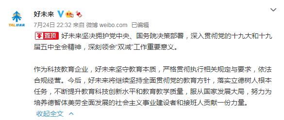 此后,好未来也表示,坚决拥护党中央、国务院决策部署,深刻领会“双减”工作重要意义。作为科技教育企业,好未来坚守教育本质,严格贯彻执行相关规定与要求,依法合规经营。今后,好未来将继续坚持全面贯彻党的教育方针,落实立德树人根本任务,不断提升教育科技创新水平和教育教学质量,服从国家发展大局,努力为培养德智体美劳全面发展的社会主义事业建设者和接班人贡献一份力量。