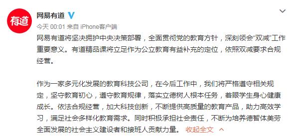 25日凌晨,网易有道和猿辅导也纷纷表态,坚决拥护相关决策部署。网易有道将深刻领会“双减”工作重要意义,有道精品课将立足作为公立教育有益补充的定位,依照双减要求合规经营。猿辅导称,深刻认识“双减”重大意义,主动对标“双减”工作要求,严格贯彻落实。