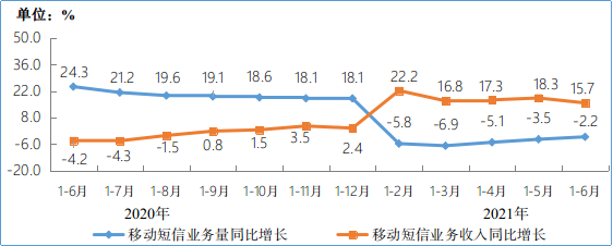 图8 2020-2021年1-6月移动短信业务量和收入同比增长情况