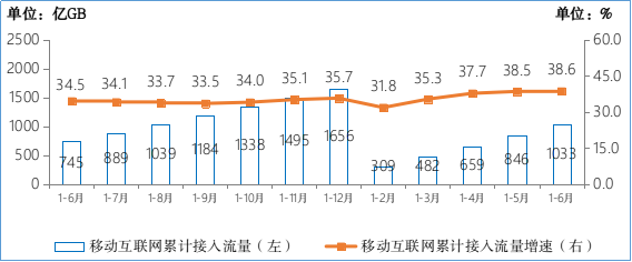 移动互联网流量大幅增长,6月DOU值仍处较高水平。上半年,移动互联网累计流量达1033亿GB,同比增长38.6%,实现连续四个月提速增长。其中,通过手机上网的流量达到989亿GB,同比增长37.4%,占移动互联网总流量的95.8%。6月当月户均移动互联网接入流量(DOU)达到13.52GB/户·月,同比增长33.4%,比上年底高1.6GB/户·月。