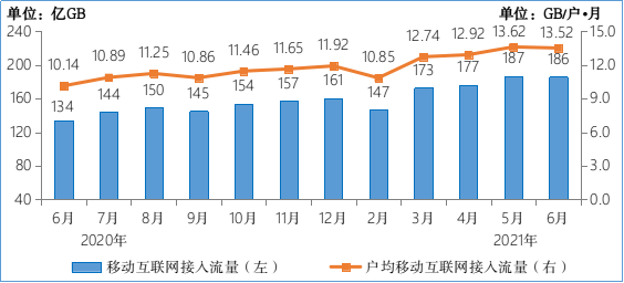 图6 2020-2021年6月移动互联网接入月流量及户均流量(DOU)情况