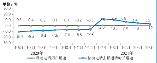 图7 2020-2021年1-6月移动电话用户增速和通话时长增速