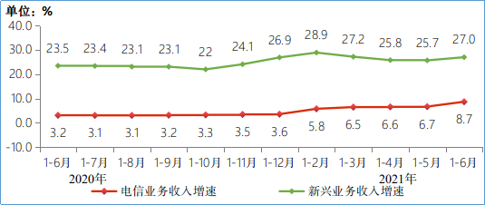 图2 2020-2021年1-6月电信业务收入分类增长情况