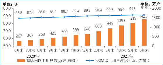 图3 2020年-2021年6月末100M速率以上、1000M速率以上的固定互联网宽带接入用户情况