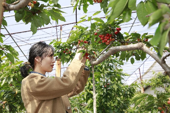 游客在山东省临沂市莒南县坪上镇的大棚樱桃园里采摘樱桃。2019年11月,“厉家寨”站高铁开通,樱桃乘上了“复兴号”。