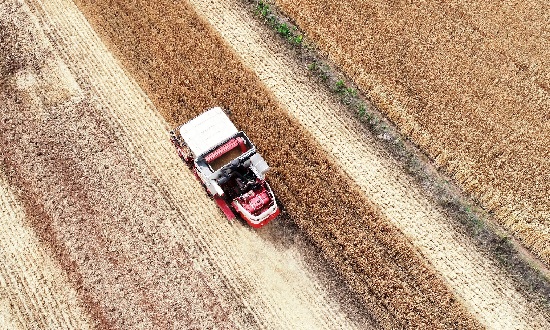 6月1日在山东省临沂市郯城县郯城街道三井村田间拍摄的收割现场(无人机照片)。