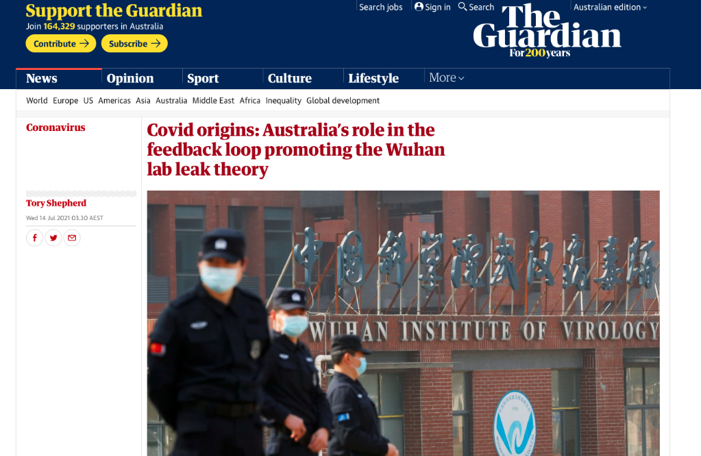 《卫报》澳大利亚版刊文《新冠溯源:澳大利亚在推动武汉实验室泄漏论中扮演了什么角色》,揭露澳大利亚记者沙丽·马克森与美国右翼势力联手炒作新冠病毒“实验室泄漏论”的相关内幕。(网页截屏)