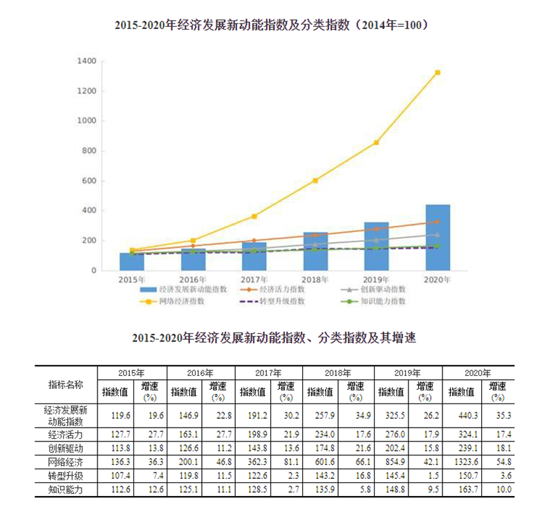 为动态监测我国经济发展新动能变动情况,国家统计局统计科学研究所在《新产业新业态新商业模式统计监测制度》和经济发展新动能统计指标体系的基础上,采用定基指数方法测算了2020年我国经济发展新动能指数,并修订了2015-2019年历史指数数据。结果显示,2015-2020年我国经济发展新动能指数(以2014年为100)分别为119.6、146.9、191.2、257.9、325.5和440.3,分别比上年增长19.6%、22.8%、30.2%、34.9%、26.2%和35.3%。2020年,各项分类指数与上年相比均有提升,其中,网络经济指数增长最快,对总指数增长的贡献最大。