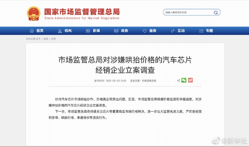 针对汽车芯片市场哄抬炒作、价格高企等突出问题,市场监管总局近日根据价格监测和举报线索,对涉嫌哄抬价格的汽车芯片经销企业立案调查。下一步,市场监管总局将持续关注芯片等重要商品市场价格秩序,进一步加大监管执法力度,严厉查处囤积居奇、哄抬价格、串通涨价等违法行为。(记者赵文君)