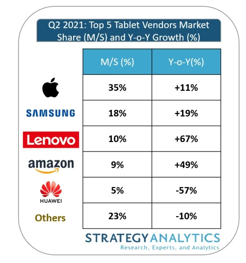 据 Strategy Analytics 官方公众号,该机构发布的一份研究报告显示,2021 年第二季度,全球平板电脑出货量同比增长 5%,实现了五季度连续增长。