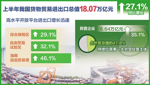 除了数量增长之外,上半年外贸高质量发展也取得明显成果。比如,高水平开放平台增长迅速。上半年,我国综合保税区、自由贸易试验区、海南自由贸易港进出口增速均显著高于我国外贸总体增速。同时,市场主体活力明显增强。有进出口实绩企业47.9万家,增长8.1%。民营企业进出口增长35.1%,高于外贸整体增速8个百分点。此外,新业态新模式加快培育、对主要贸易伙伴较快增长、商品结构更趋优化、服务贸易创新发展等特点也较突出。
