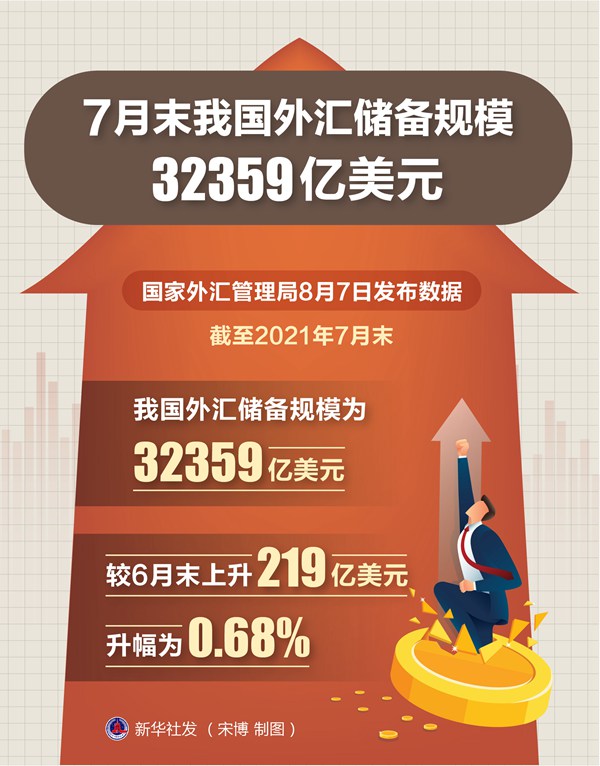 新华社北京8月7日电(记者刘开雄)国家外汇管理局7日发布数据,截至2021年7月末,我国外汇储备规模为32359亿美元,较6月末上升219亿美元,升幅为0.68%。