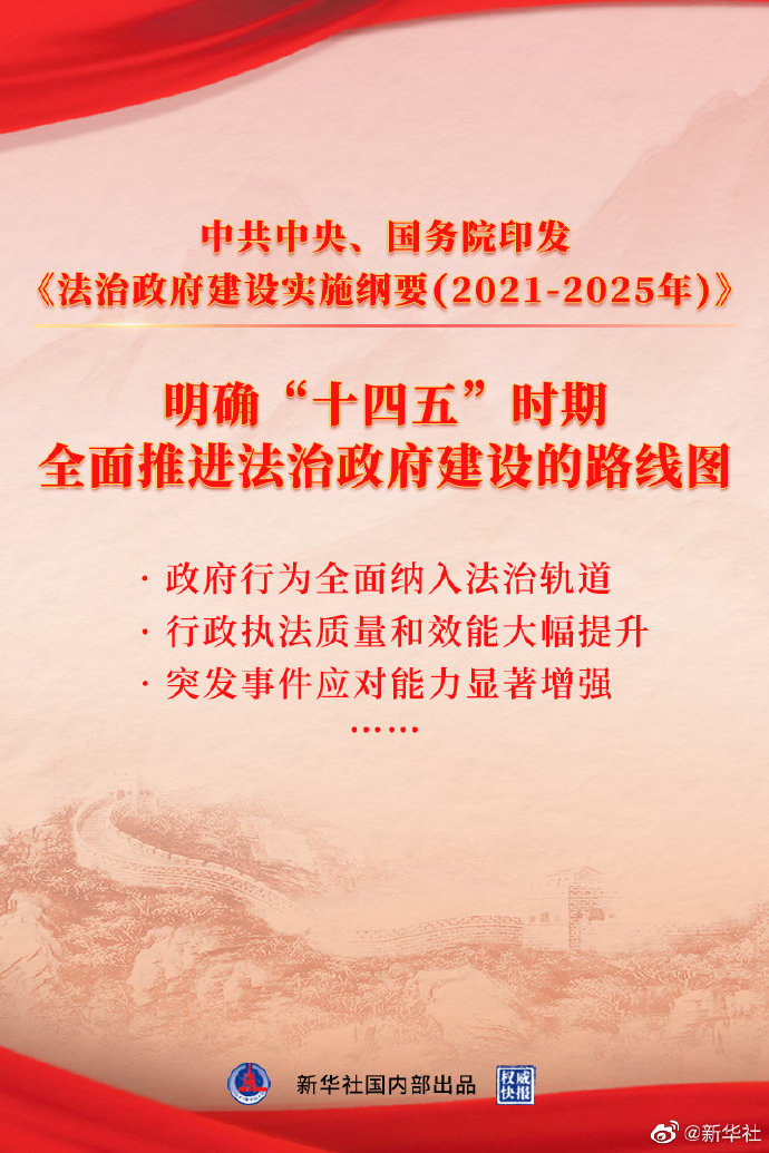 中共中央、国务院近日印发的《法治政府建设实施纲要(2021-2025年)》确立了今后五年法治政府建设的总体目标,明确到2025年,政府行为要全面纳入法治轨道。纲要还提出,着力实现行政执法水平普遍提升,努力让人民群众在每一个执法行为中都能看到风清气正、从每一项执法决定中都能感受到公平正义。(记者白阳,海报设计杨轶群)