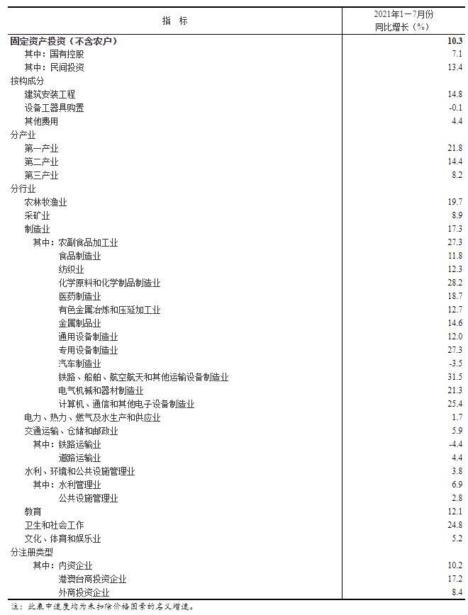 2021年1—7月份固定资产投资(不含农户)主要数据