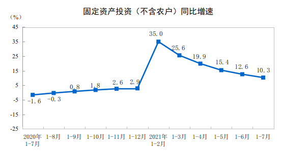 1—7月份,全国固定资产投资(不含农户)302533亿元,同比增长10.3%;比2019年1—7月份增长8.7%,两年平均增长4.3%。其中,民间固定资产投资173473亿元,同比增长13.4%。从环比看,7月份固定资产投资(不含农户)增长0.18%。
