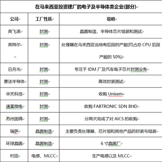 公开资料显示,马来西亚是全球半导体产品第七大出口国。目前有超过50家半导体厂在当地设厂,其中不乏英特尔、英飞凌、意法半导体、恩智浦、德州仪器、安森美等国际半导体巨头,当地封测产能约占全球封测产能的13%。
