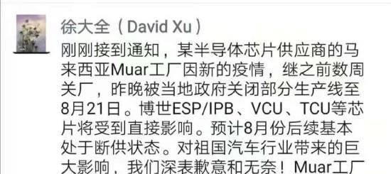 “某半导体芯片供应商的马来西亚Muar工厂因新的疫情,继之前数周关厂,昨晚被当地政府关闭部分生产线至8月21日。”博世(中国)投资有限公司执行副总裁徐大全近期表达了对芯片产能的担忧,“博世ESP/IPB、VCU、TCU等芯片将受到直接影响。预计8月份后续基本处于断供状态。”